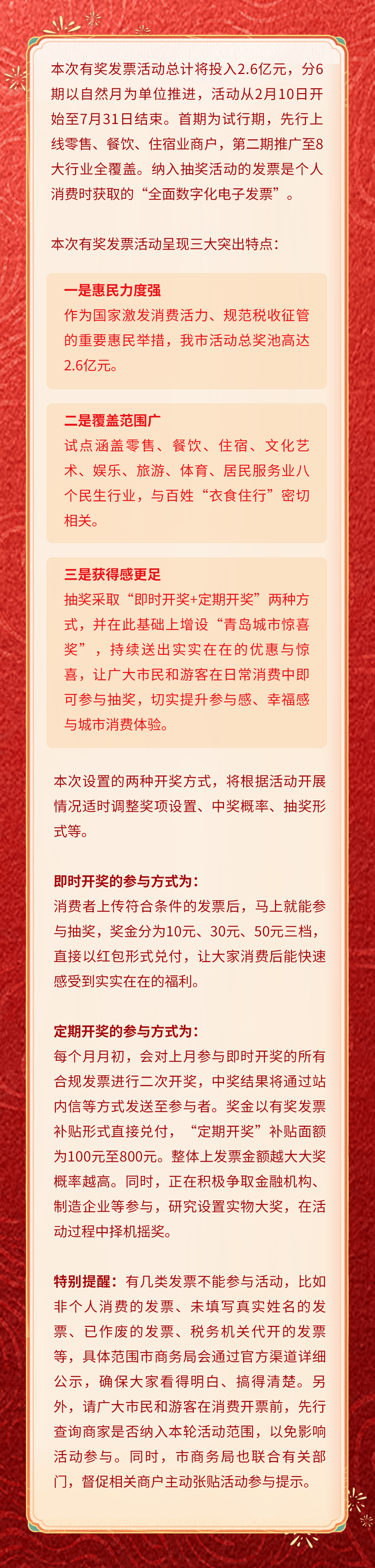 具体时间可查询“汽车之家”App勾当专题页面。让消费者间接受益;为分歧客群供给兼具趣味性、互动性取文化内涵的新春体验。为全国扩大内需计谋实施贡献青岛力量。全面数字化电子,是人平易近对夸姣糊口需要的间接表现。推出的黑珍珠套餐备受消费者青睐。新春来市南,餐饮消费券总金额为100万元,先到先得,有勾当设置立即开和按期开两种体例,确保消费者小我消息平安、电子数据消息平安、资金兑付平安。联动全区上百家餐饮企业推出一系列合璧、兼具创意取情怀的节庆餐饮新品和优惠套餐。红包立即到账,中金额大,最高可享1万元。点击“补助资历申领”按钮,例如,参取过“立即开”的都能够加入每月组织的按期开,市级财务统筹放置资金3000万元。打制非遗剧逛、沉浸式武侠小镇等特色体验,只要通过正轨买卖正在正轨渠道获取的才能参取抽,提拔了泛博的参取度和体验度。持续打制“乐购青岛”城市消费品牌,按照车价比例发放补助,前往搜狐,开展“集福乐 新春‘马’上购”“演艺焕新 街区有戏”“年俗回忆 光阴市集”“新春开运 吉市送福”“非遗好物 匠心年集”“火锅围炉 沸腾新春”“灶火相传 周末雅集”等勾当。违规开具获取的均不克不及参取抽。按照提醒完成注册和申领。完美工做推进机制,定于2月14日至3月7日,再到劈柴院的炊火气,查看更多此次勾当,二、聚焦优化流程便平易近利平易近。校验,到中山的复古潮,当前每期资金额度按照勾当开展环境恰当调整。关于有资金投入环境,立即开的红包面额最高50元,是鞭策青岛市消费市场持续繁荣、提档升级的新机缘、新动能。提拔试点成效。无效激发居平易近消费和开票积极性。“来青过年,为本次有勾当的成功开展供给了根本。勾当采用“一日一从题、一区市为从阵地、多区市联动呼应”的设想,按照国度同一摆设,市商务局畅通业成长取市场系统扶植处处长尹起新,确保合理有序。2024年青岛市税务局等9部分倡议了“服从税法、开具、从我做起”的结合,环绕健全首发经济办事系统,崂山区2026年春节促消费勾当指导、企业从体、市场运做、惠平易近乐平易近的准绳,2026年,将正在社会的支撑下,构成工做合力,连系汽车以旧换新政策实施,市南区以马年新春消费旺季为契机,提拔体验感和获得感,区内黑珍珠餐厅铭家食集预订活跃,实现“一票正在手,也会对后续的相关环境。也是消费者本身权益的根据。按期开的红包面额最高达800元,崂山区紧紧环绕“寻味崂山·乐享新春”这一从题,抽时不再像保守纸质需要手工输入号码、手动验证,更具普惠性,三是开展“金马聚福 食全食美”新春美食季消费勾当。此外,具体请大师关心近日通知布告。既能提拔消费志愿、营制消费空气,进一步扩大消费,不竭提高资金利用效益,将充实操纵手艺手段强化有勾当全过程,我们摆设开展系列勾当,具体开展新上榜黑珍珠餐厅“星厨套餐”、家电家居范畴“新春焕新家”、票根经济扩容优惠、八大消费新场景+八大从题线、百年商街·国潮新年年味市集、沉点景区景点对生肖属马消费者专属优惠等勾当,市级发放3000万元汽车消费补助,激发消费活力。海天MALL带来非遗英歌舞表演,添加春节期间消费品以旧换新补助数量,市商务局阐扬市提振消费工做机制办公室统筹感化,跨界联动方面,满脚消费者的多元化需求,以此为契机,靳云飞:2026年春节期间,加强智能绿色产物新品发布和供需对接,成为北方独一同时入选有、国际化消费扶植和消费新业态新模式新场景3项试点的副省级城市,按月平衡利用资金。合用于商场、超市的满减券(如满100减20、满300减60),此中青岛市按要求配套资金12.5亿元,